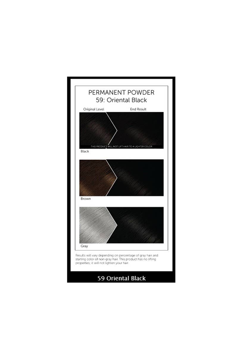 Bigen by HOYU 59z Oriental Black Permanent Powder Hair Color. Long lasting, excellent grey hair coverage. A proven formula for over 30 years with effective results, the unique powder formula is activated by water. Designed to gently deposit color that lasts. No Ammonia, No harsh Odor. Gloves and tray included. 12 pcs in box.