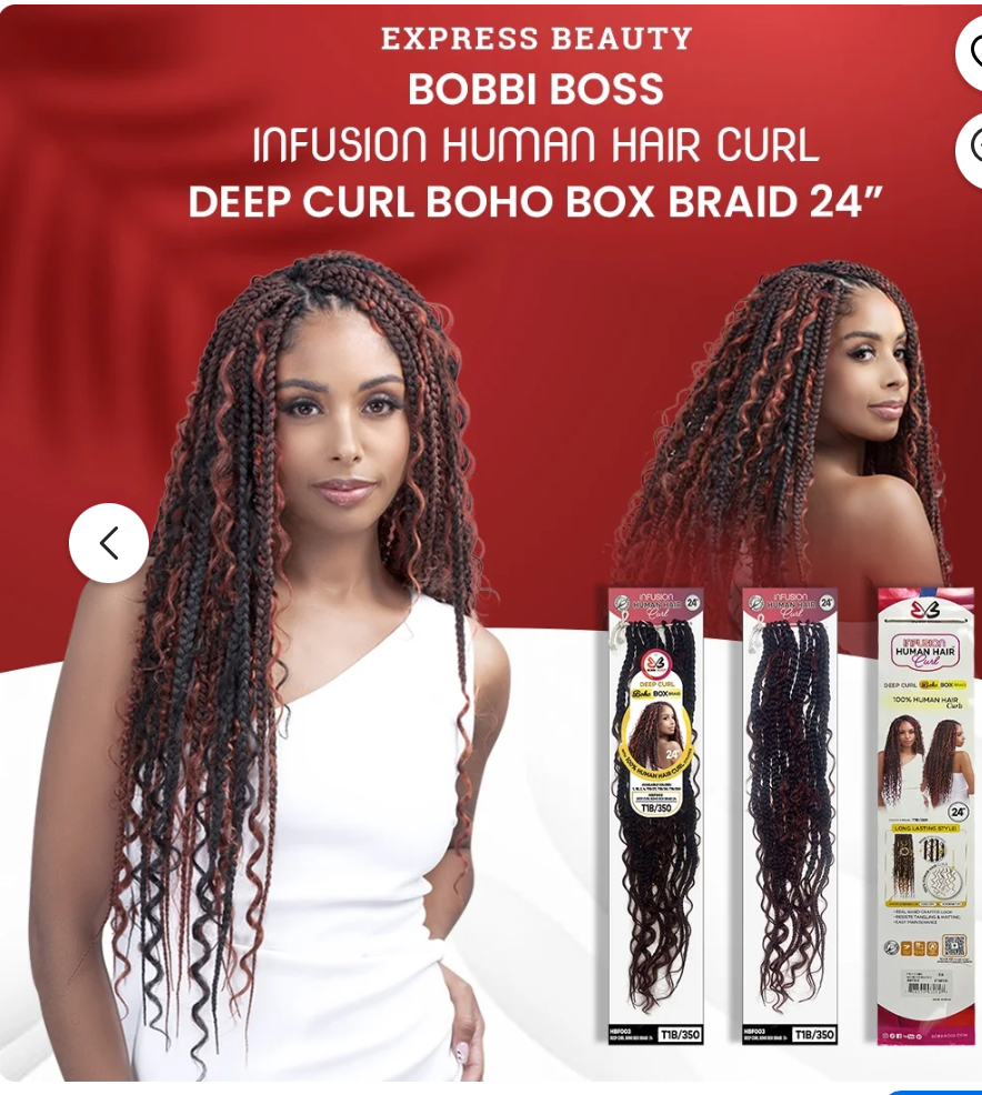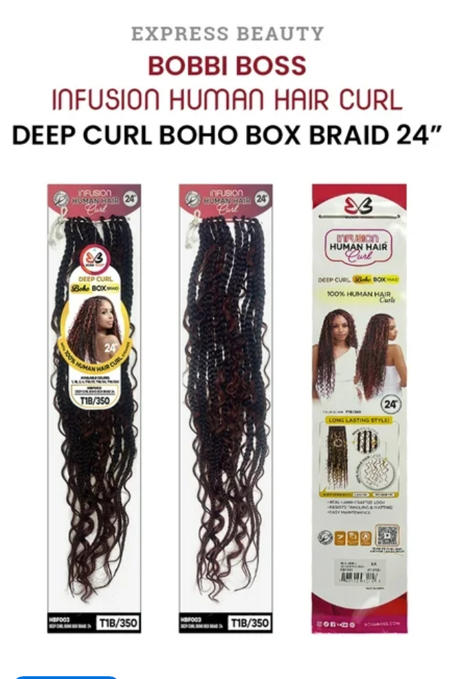 Achieve effortless boho style with Bobbi Boss Human Hair Deep Curl Strands. Made with infusion human hair, these 24'' box braids offer a natural, textured look. Say goodbye to synthetic hair and hello to authentic, flowing locks. Upgrade your braid game today!
