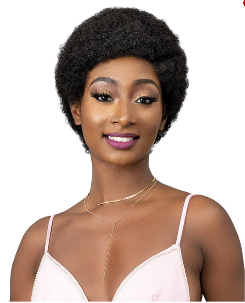 Expertly crafted with premium synthetic fibers, the Janet-natural-afro-abbo-wig offers a realistic and natural look that is easy to style and maintain. The high-quality material ensures long-lasting wear, perfect for those seeking a low-maintenance and effortless hair solution. Elevate your look with this top-of-the-line wig.