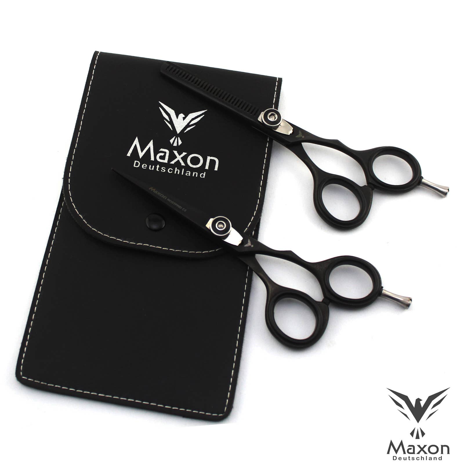 With the luxury cutting scissors and thinning shears from Maxon, you can now easily get started at home with cutting and thinning hair and beards. The premium, ergonomic hairdressing scissors from Maxon are 15 cm long and have blades of approx. 6 cm, are made of stainless steel, powder coated and have diamond-cut blades. The cutting blades are as sharp as a razor and stay sharp for an incredibly long time. Top quality from Maxon Deutschland and ideal for professional hairdressers and home users. These cutting scissors and thinning scissors come in a beautiful, leather case in which they both fit perfectly.