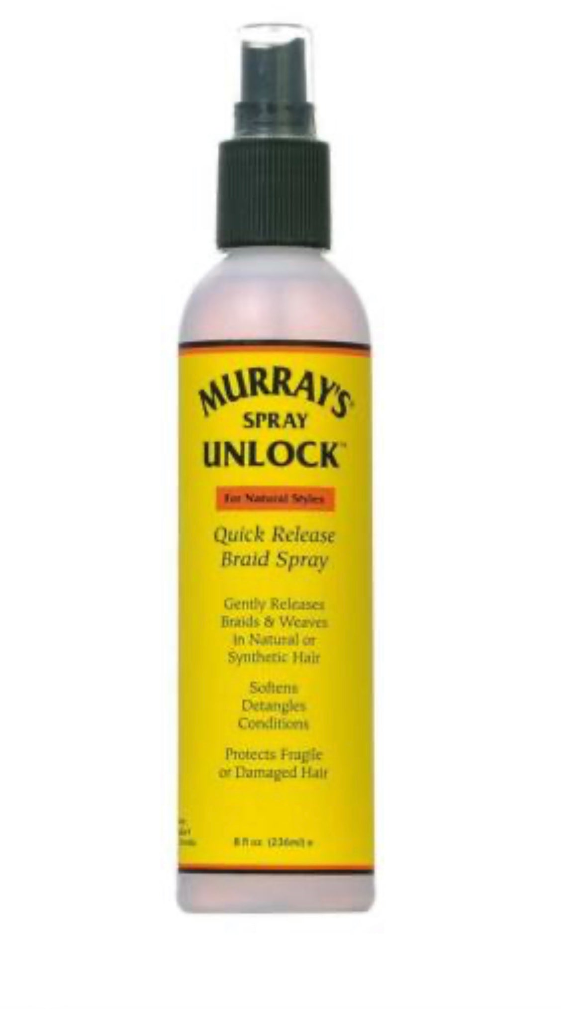 Murray's Unlock Spray is the perfect solution for quickly and safely removing braids and weaves without damaging hair. Excellent before preparing and conditioning hair. The medicated formula will help to fight dry scalp and fragile hair. Can be used on both natural and synthetic hair. 8oz. bottle.