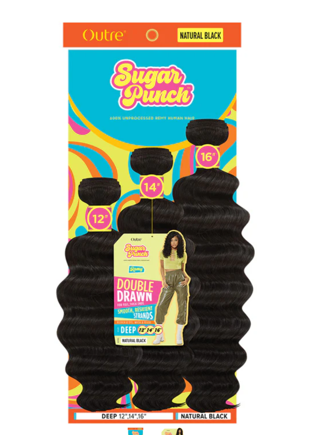 Experience premium quality with OUTRE Sugar Punch, featuring 100% unprocessed Remy human hair in deep wave texture. Available in 10", 12", and 14" lengths, this double drawn hair ensures consistent thickness from root to tip for a fuller, natural look. Ideal for versatile styling, it maintains softness and durability, providing a seamless blend and long-lasting wear for professional results.