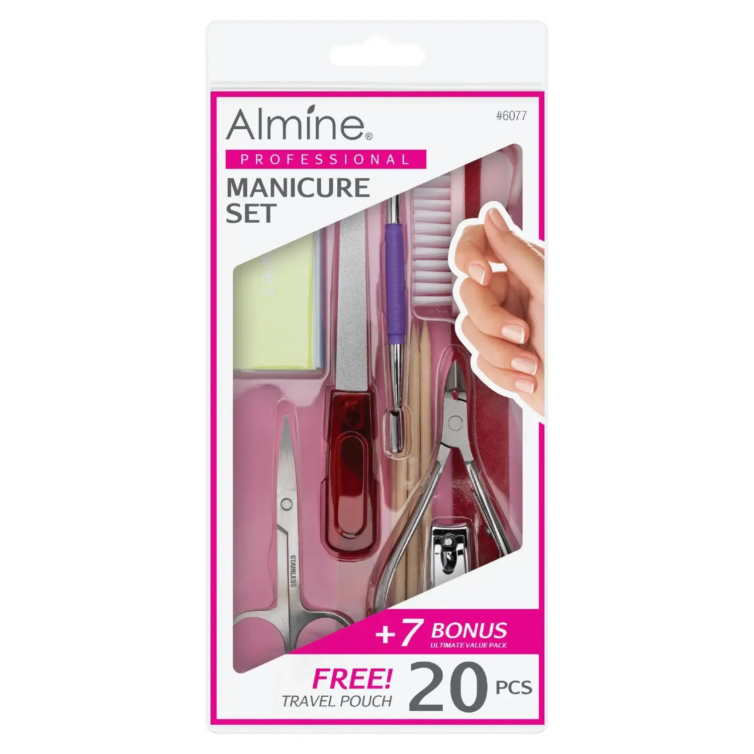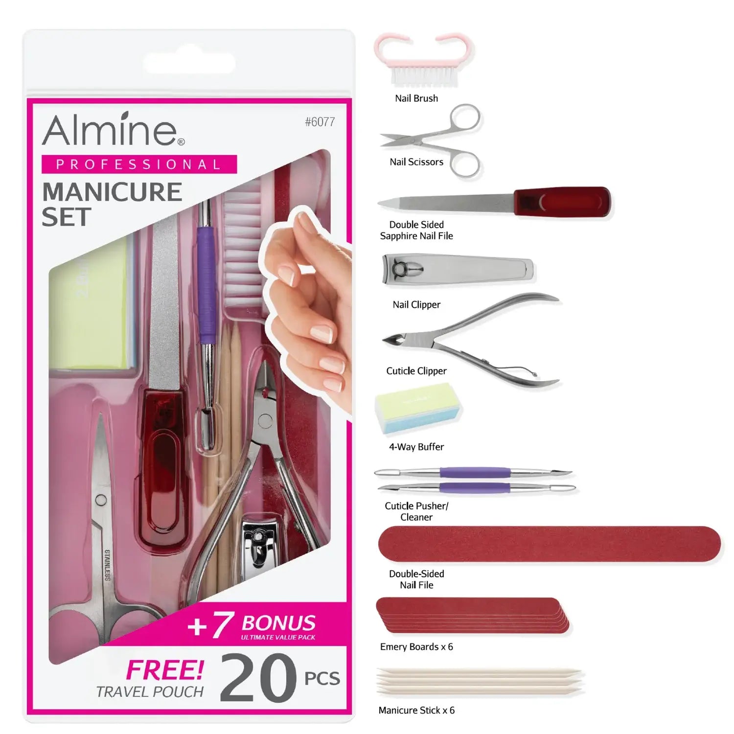Maintain your nails in top condition with the Almine Professional Manicure Set, containing 20 essential pieces to help keep your nails sharp and looking flawless no matter where you go! This professional set includes a 4-way buffer, double sided sapphire file, curved nail scissors, nail clippers, a nail brush and salon board, for the perfect salon-style manicure. The convenient travel pouch allows you to stay organized wherever you go. Maintain your nails in perfect condition with the Almine Professional Manicure Set!