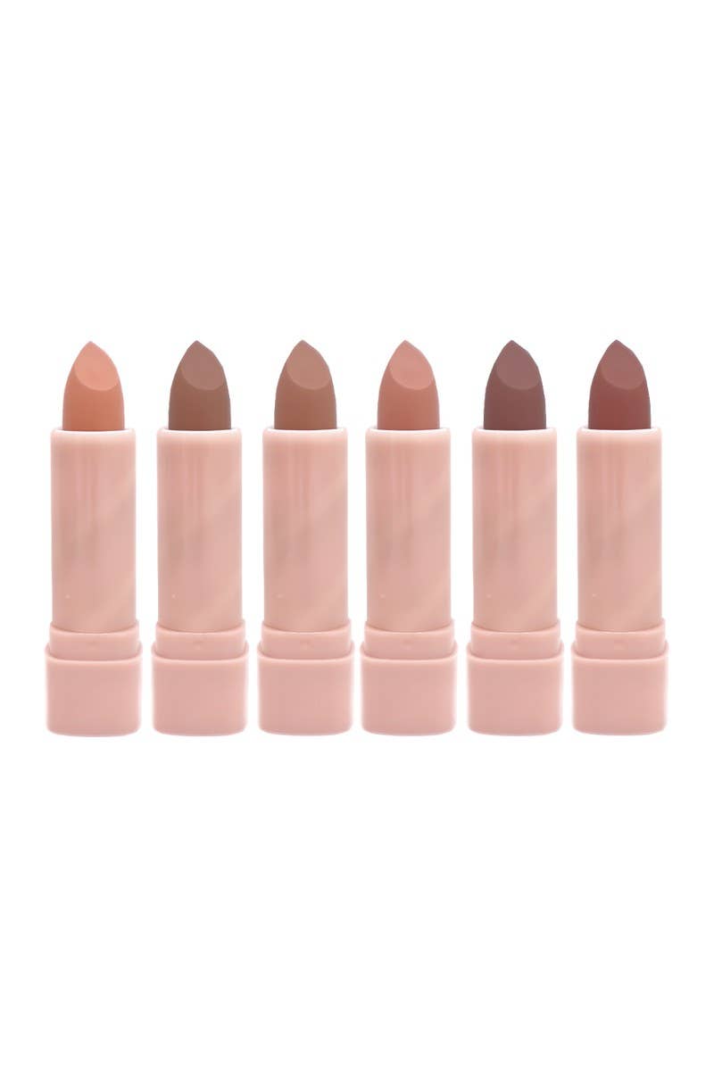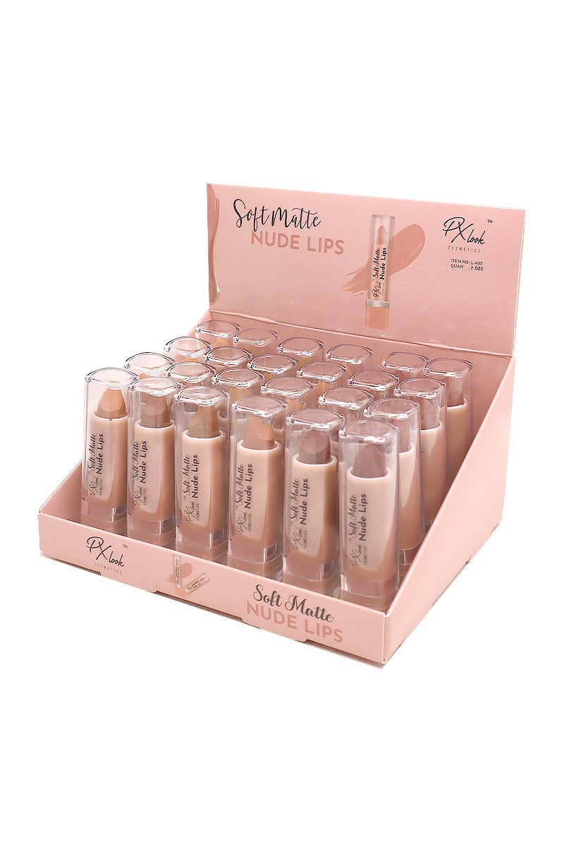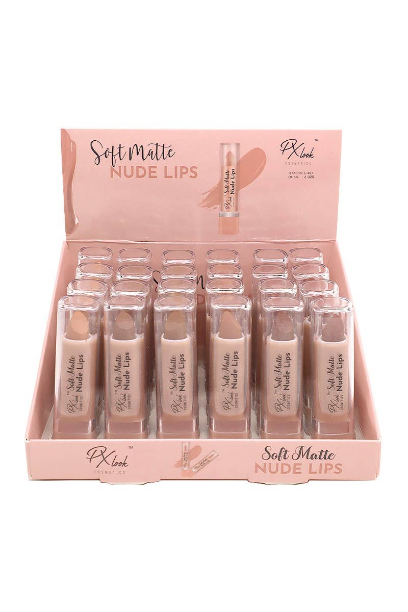 PX Look Cosmetics L497x Soft Matte Nude Lipstick. A soft matte formula with a creamy texture that glides onto lips smoothly. Assorted in 6 perfect nude shades. 24 pcs in display.