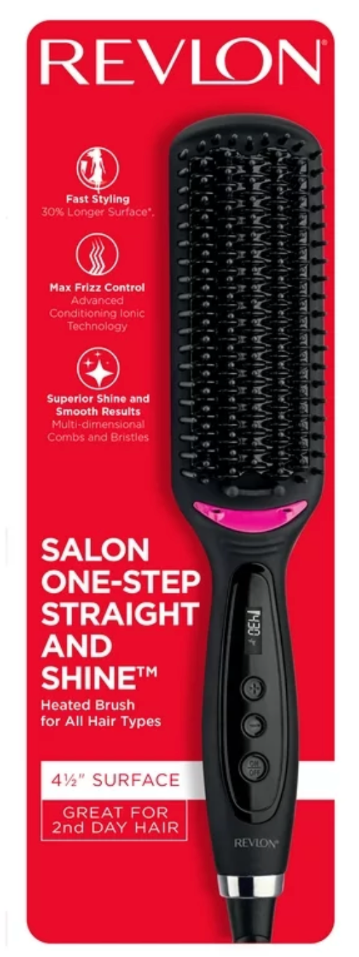 Achieve sleek and shiny hair with ease using the Revlon Heated Brush for All Hair Types. Its 4 1/2 inch surface and Salon One Step Straight and Shine feature provide professional results in a single step. Say goodbye to frizz and hello to smooth, straight locks.