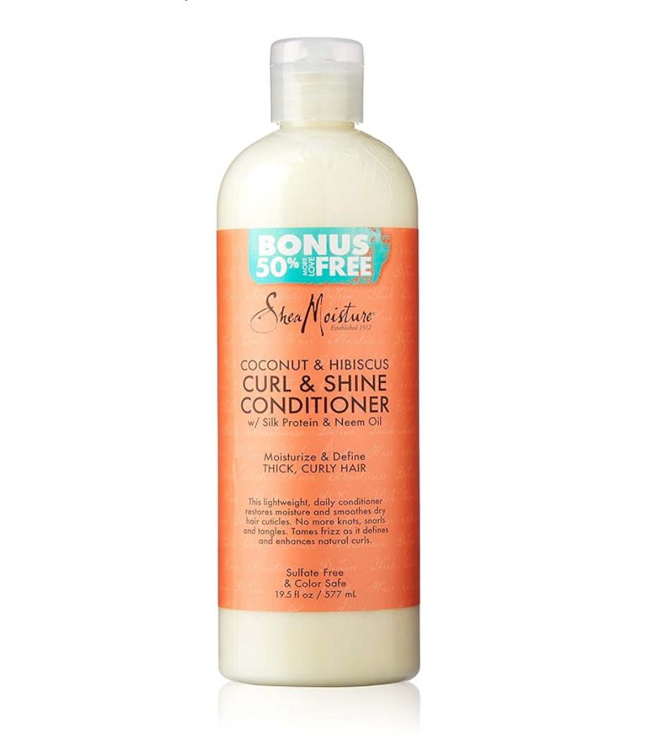 This 19.8 oz Shea Moisture Curl & Shine Conditioner features a blend of coconut and hibiscus, known for their nourishing and hydrating properties. Formulated for curly, thick hair, this conditioner helps to detangle, define curls, and add natural shine. Ideal for achieving healthy and bouncy curls.
